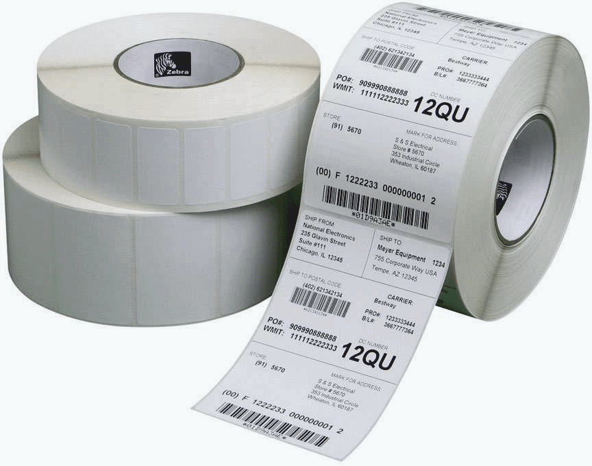 Etichete autoadezive imprimate negru, dispuse în rolă